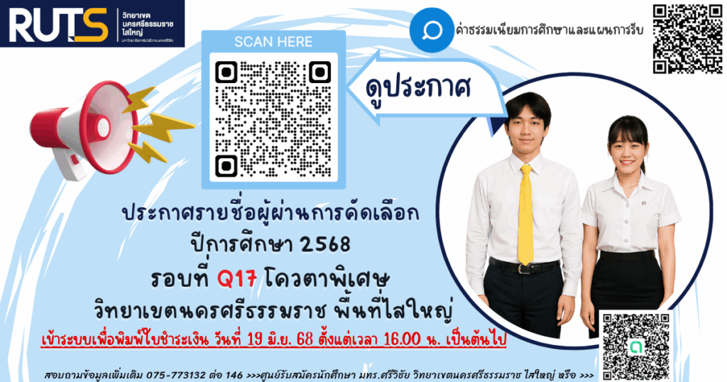 ประกาศรายชื่อผู้ผ่านการคัดเลือก ปีการศึกษา 2568 รอบที่ Q17 โควตาพิเศษ วิทยาเขตนครศรีธรรมราช พื้นที่ไสใหญ่ โดยผู้ผ่านการคัดเลือกดำเนินการตามขั้นตอน และดูประกาศได้จากลิงค์ดาวน์โหลดด้านล่าง