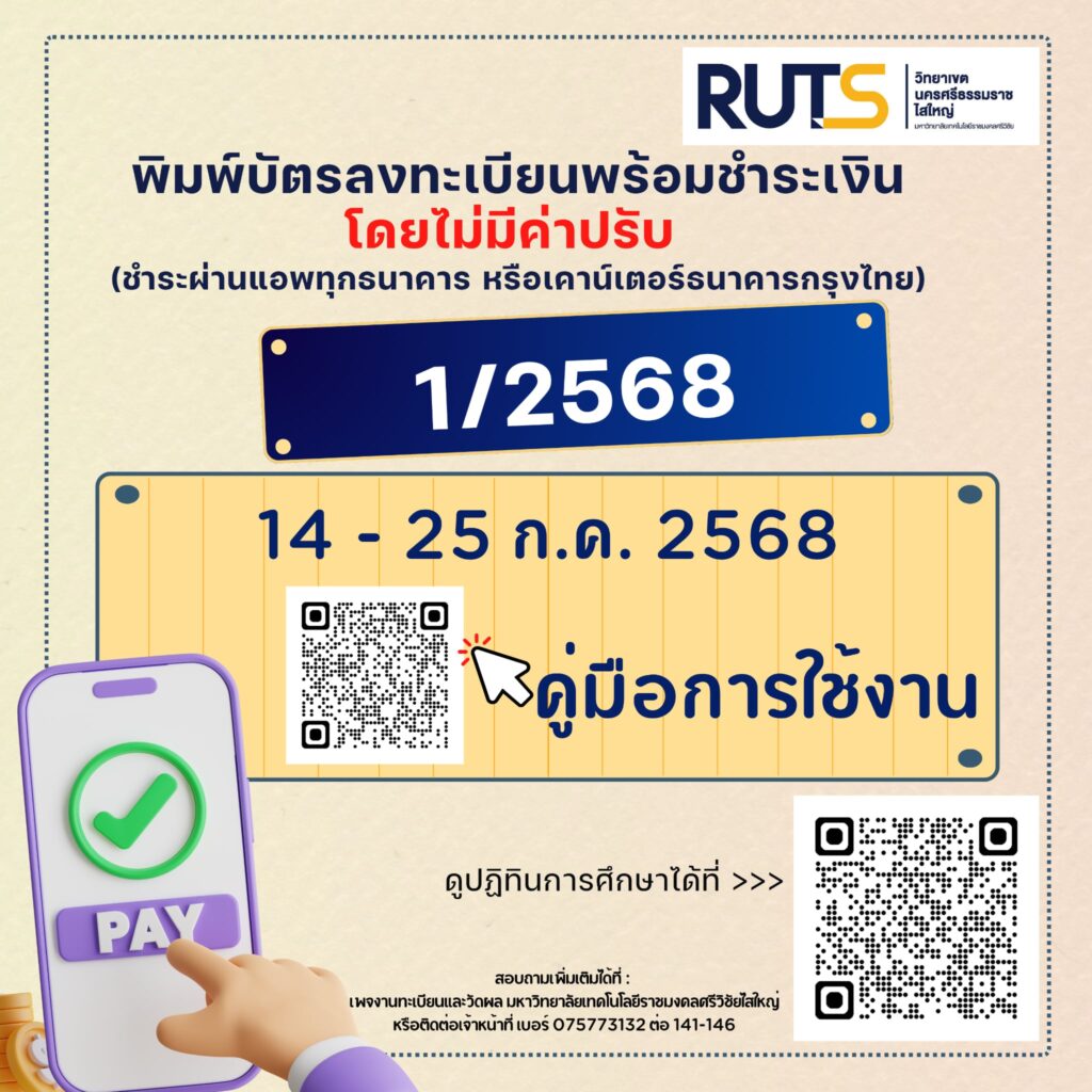 หลังจากชำระเงินให้เก็บหลักฐานให้ดีห้ามหาย และรอปรับสถานะไม่เกิน 7 วันทำการ หากเกินระยะเวลาที่กำหนด สามารถติดต่อ แผนกการเงินเพื่อสอบถามข้อมูลเพิ่มเติม ได้ที่ 075-773131 ต่อหมายเลขภายใน 123