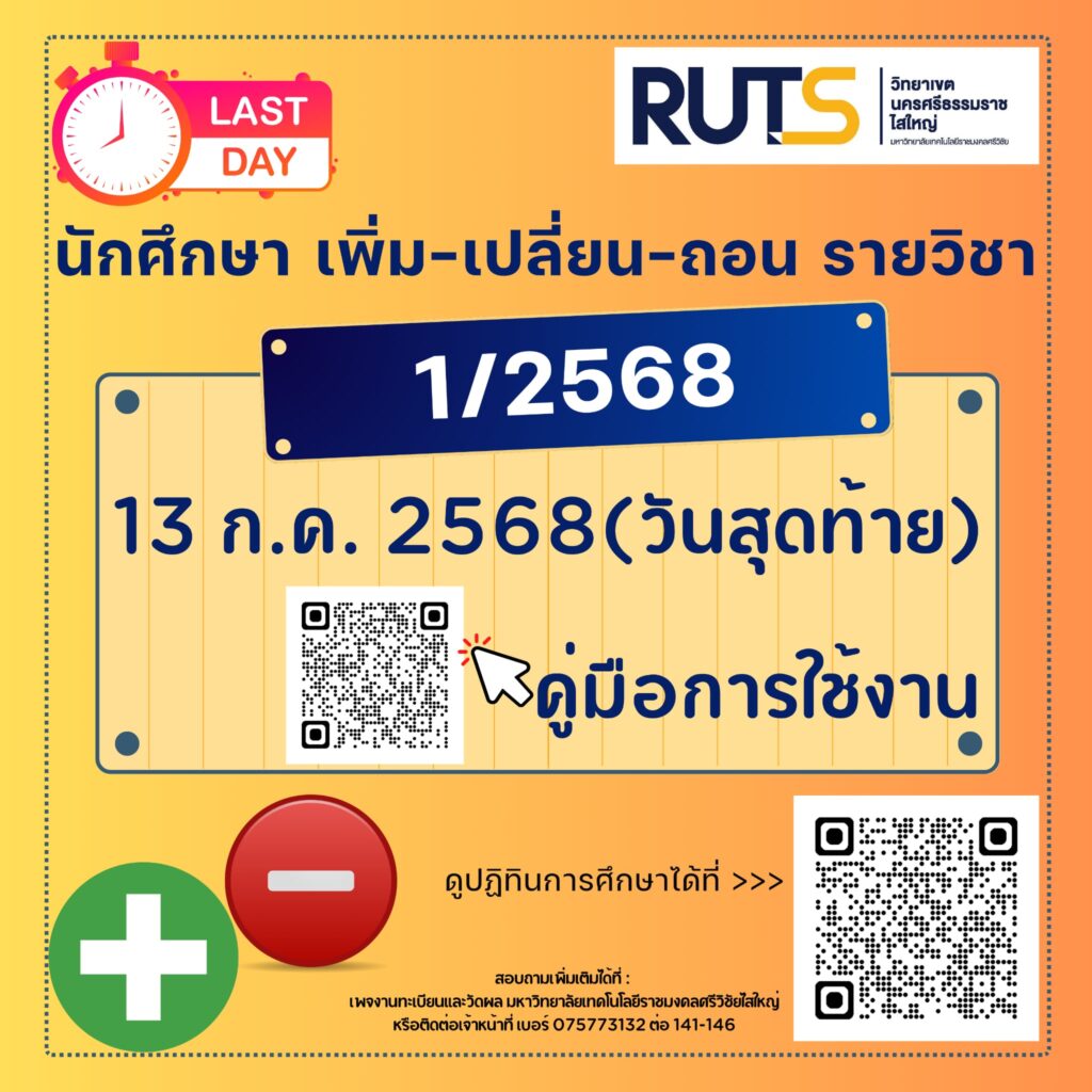 13 กรกฎาคม 2568 วันสุดท้ายนักศึกษา เพิ่ม-เปลี่ยน-ถอน รายวิชา (สามารถดำเนินการได้ทั้งรายวิชาในแผนและนอกแผนโดยการค้นหาจาก ชื่อ/รหัสวิชา)