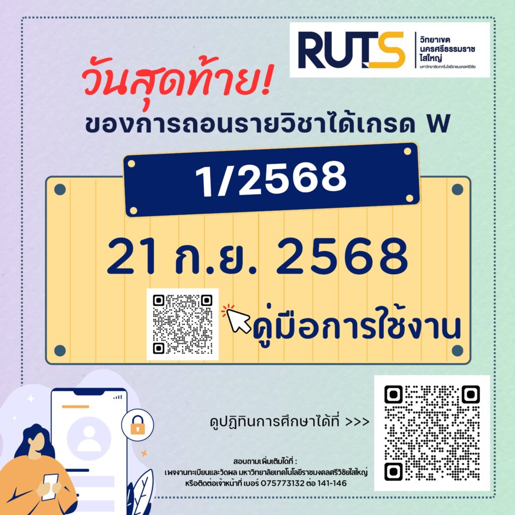 แจ้งนักศึกษาที่ประสงค์ขอถอนรายวิชาได้เกรด W ดำเนินการขอถอนรายวิชา ผ่านระบบ https://sis.rmutsv.ac.th/ ให้แล้วเสร็จภายในวันที่ 21 กันยายน 2568 (14 ก.ค. – 21 ก.ย. 68)