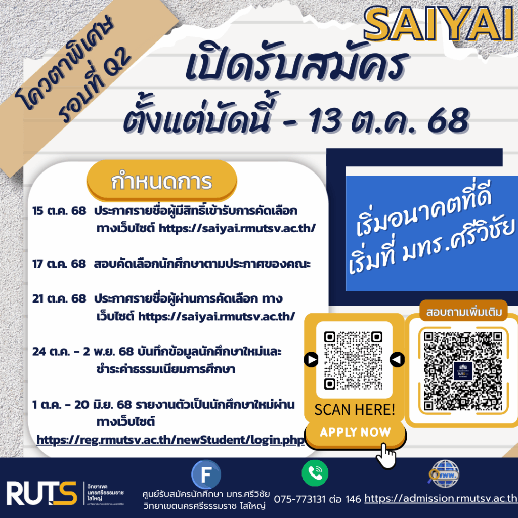มหาวิทยาลัยเทคโนโลยีราชมงคลศรีวิชัย วิทยาเขตนครศรีธรรมราช พื้นที่ไสใหญ่ เปิดรับสมัครนักศึกษา ปีการศึกษา 2569