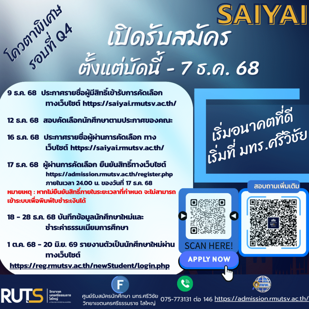 สามารถสมัครเรียนได้ตั้งแต่ 10 พ.ย. – 7 ธ.ค. 68 ผ่านทาง https://admission.rmutsv.ac.th/register.php