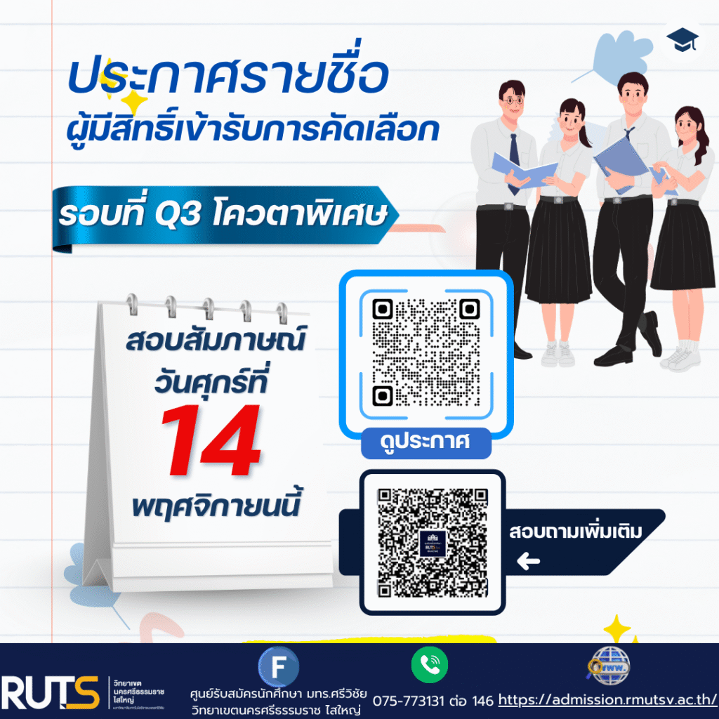 ประกาศรายชื่อ ผู้มีสิทธิ์เข้ารับการคัดเลือก ปีการศึกษา 2569 รอบที่ Q3 โควตาพิเศษ วิทยาเขตนครศรีธรรมราช พื้นที่ไสใหญ่ เข้าสู่กระบวนการคัดเลือก โดยวิธีการสอบสัมภาษณ์แบบออนไลน์ ในวันที่ 14 พฤศจิกายน 2568 หรือ ให้นักศึกษาดูประกาศของคณะที่สมัคร ที่เอกสารแนบด้านล่าง อย่างละเอียด!