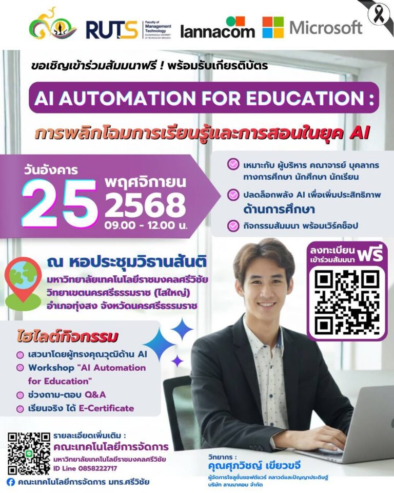 สามารถสมัครเรียนได้ตั้งแต่ 14 – 28 พ.ย. 68 ผ่านทาง https://admission.rmutsv.ac.th/SrivijayaFair/