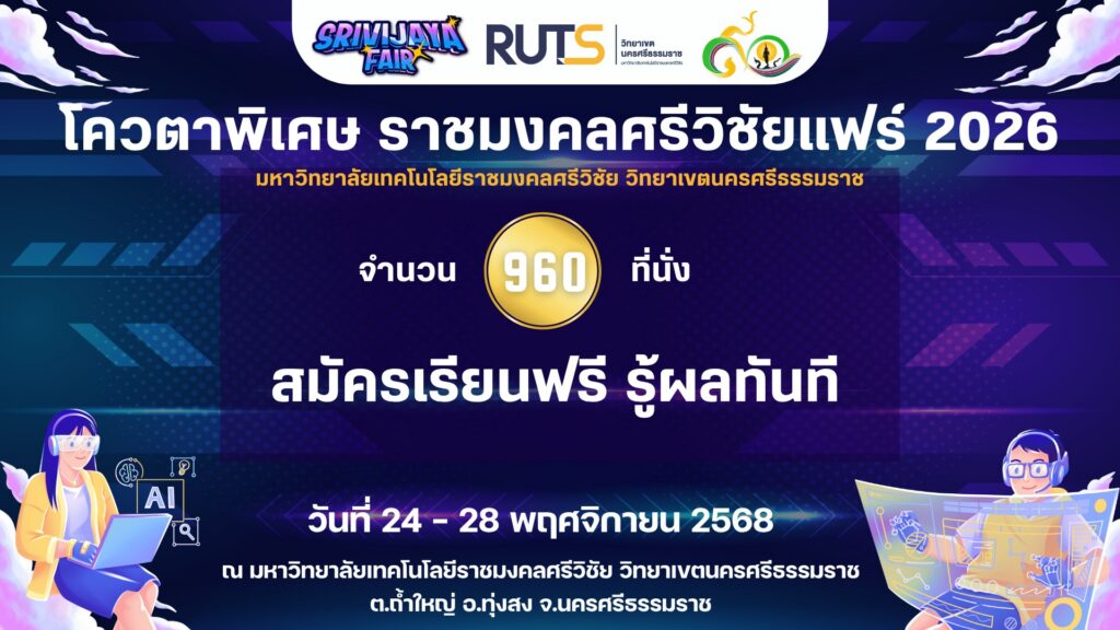 มหาวิทยาลัยเทคโนโลยีราชมงคลศรีวิชัย วิทยาเขตนครศรีธรรมราช (พื้นที่ ทุ่งใหญ่ ไสใหญ่ ขนอม) เปิดรับสมัครนักศึกษา ปีการศึกษา 2569 โควตาราชมงคลศรีวิชัยแฟร์