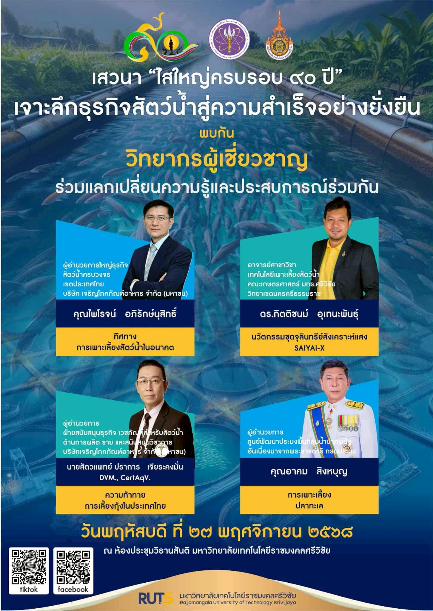 ขอเชิญเข้าร่วมเสวนา “เจาะลึกธุรกิจสัตว์น้ำสู่ความสำเร็จอย่างยั่งยืน” จัดโดย คณะเกษตรศาสตร์ มหาวิทยาลัยเทคโนโลยีราชมงคลศรีวิชัย ภายใต้การจัดงาน 90 ปี ไสใหญ่ & ราชมงคลศรีวิชัยแฟร์ 2026