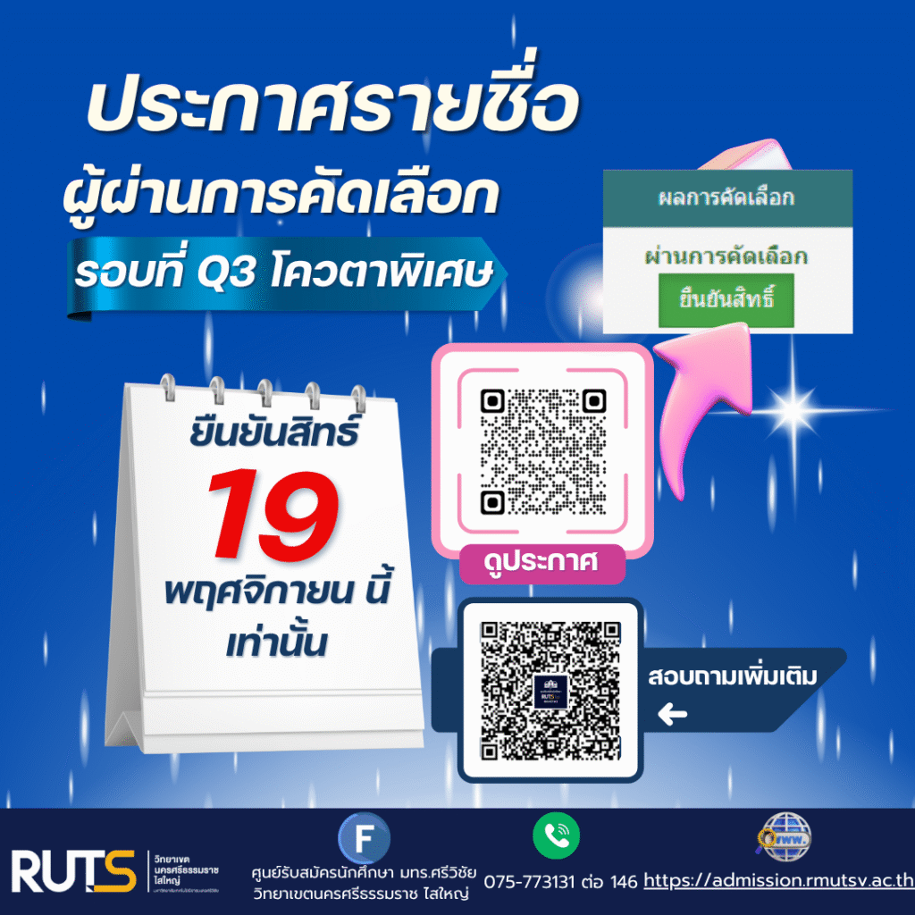 ประกาศรายชื่อผู้ผ่านการคัดเลือก ปีการศึกษา 2569 รอบที่ Q3 โควตาพิเศษ วิทยาเขตนครศรีธรรมราช พื้นที่ไสใหญ่