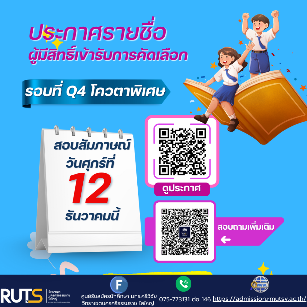 ประกาศรายชื่อ ผู้มีสิทธิ์เข้ารับการคัดเลือก ปีการศึกษา 2569 รอบที่ Q4 โควตาพิเศษ วิทยาเขตนครศรีธรรมราช พื้นที่ไสใหญ่ เข้าสู่กระบวนการคัดเลือก โดยวิธีการสอบสัมภาษณ์แบบออนไลน์ ในวันที่ 12 ธันวาคม 2568 หรือ ให้นักศึกษาดูประกาศของคณะที่สมัคร ที่เอกสารแนบด้านล่าง อย่างละเอียด!