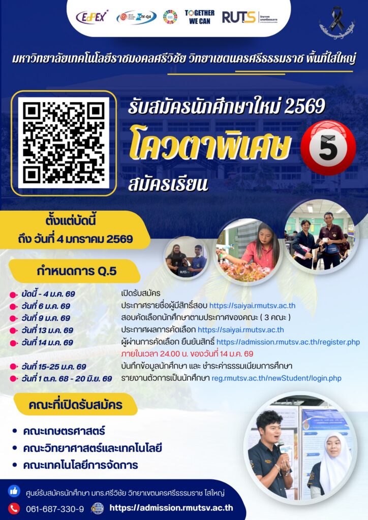 มหาวิทยาลัยเทคโนโลยีราชมงคลศรีวิชัย วิทยาเขตนครศรีธรรมราช พื้นที่ไสใหญ่ เปิดรับสมัครนักศึกษา ปีการศึกษา 2569