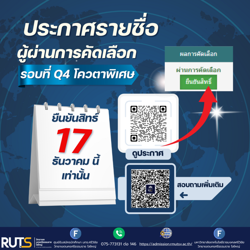 ประกาศรายชื่อผู้ผ่านการคัดเลือก ปีการศึกษา 2569 รอบที่ Q4 โควตาพิเศษ วิทยาเขตนครศรีธรรมราช พื้นที่ไสใหญ่ โดยผู้ผ่านการคัดเลือกดำเนินการตามขั้นตอน และดูประกาศได้จากลิงค์ดาวน์โหลดด้านล่าง