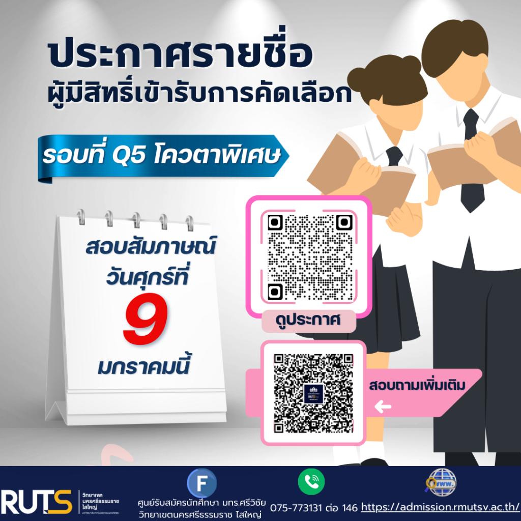 ประกาศรายชื่อ ผู้มีสิทธิ์เข้ารับการคัดเลือก ปีการศึกษา 2569 รอบที่ Q5 โควตาพิเศษ วิทยาเขตนครศรีธรรมราช พื้นที่ไสใหญ่ เข้าสู่กระบวนการคัดเลือก โดยวิธีการสอบสัมภาษณ์แบบออนไลน์ ในวันที่ 9 มกราคม 2569 หรือ ให้นักศึกษาดูประกาศของคณะที่สมัคร ที่เอกสารแนบด้านล่าง อย่างละเอียด!