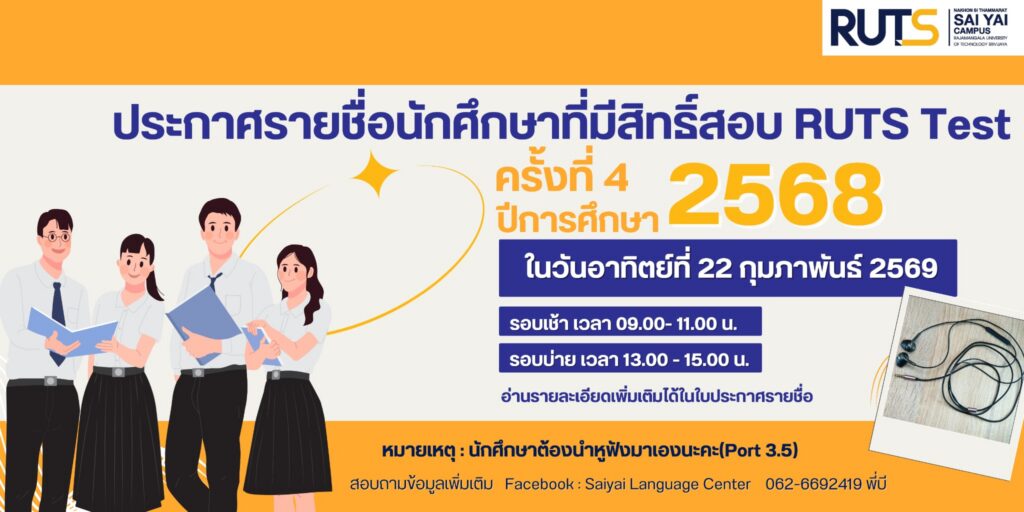 ประกาศรายชื่อนักศึกษาที่มีสิทธิ์สอบการทดสอบสมรรถนะทางด้านภาษาต่างประเทศ ครั้งที่ 4/2568 ในวันอาทิตย์ที่ 22 กุมภาพันธ์ 2569 สามารถดาวน์โหลดไฟล์ด้านล่างเพื่อดูประกาศ