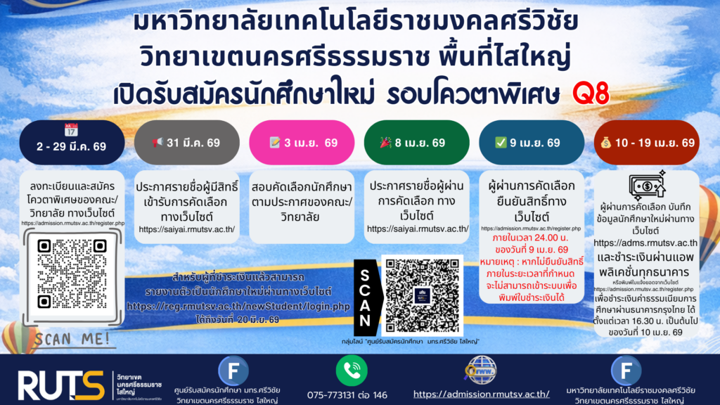 มหาวิทยาลัยเทคโนโลยีราชมงคลศรีวิชัย วิทยาเขตนครศรีธรรมราช พื้นที่ไสใหญ่ เปิดรับสมัครนักศึกษา ปีการศึกษา 2569