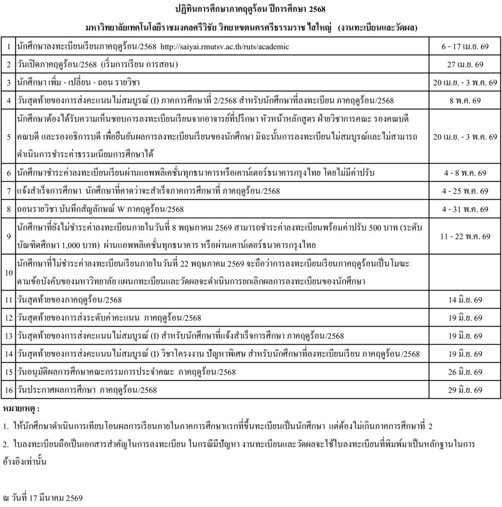ปฏิทินการศึกษา ภาคฤดูร้อน ปีการศึกษา 2568 ข้อมูล ณ วันที่ 17 มีนาคม 2569