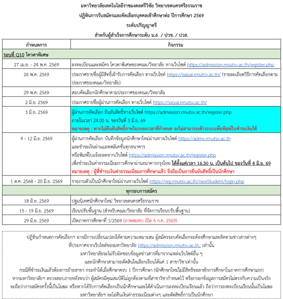 สามารถสมัครเรียนได้ตั้งแต่ 27 เม.ย. – 24 พ.ค. 69 ผ่านทาง https://admission.rmutsv.ac.th/register.php