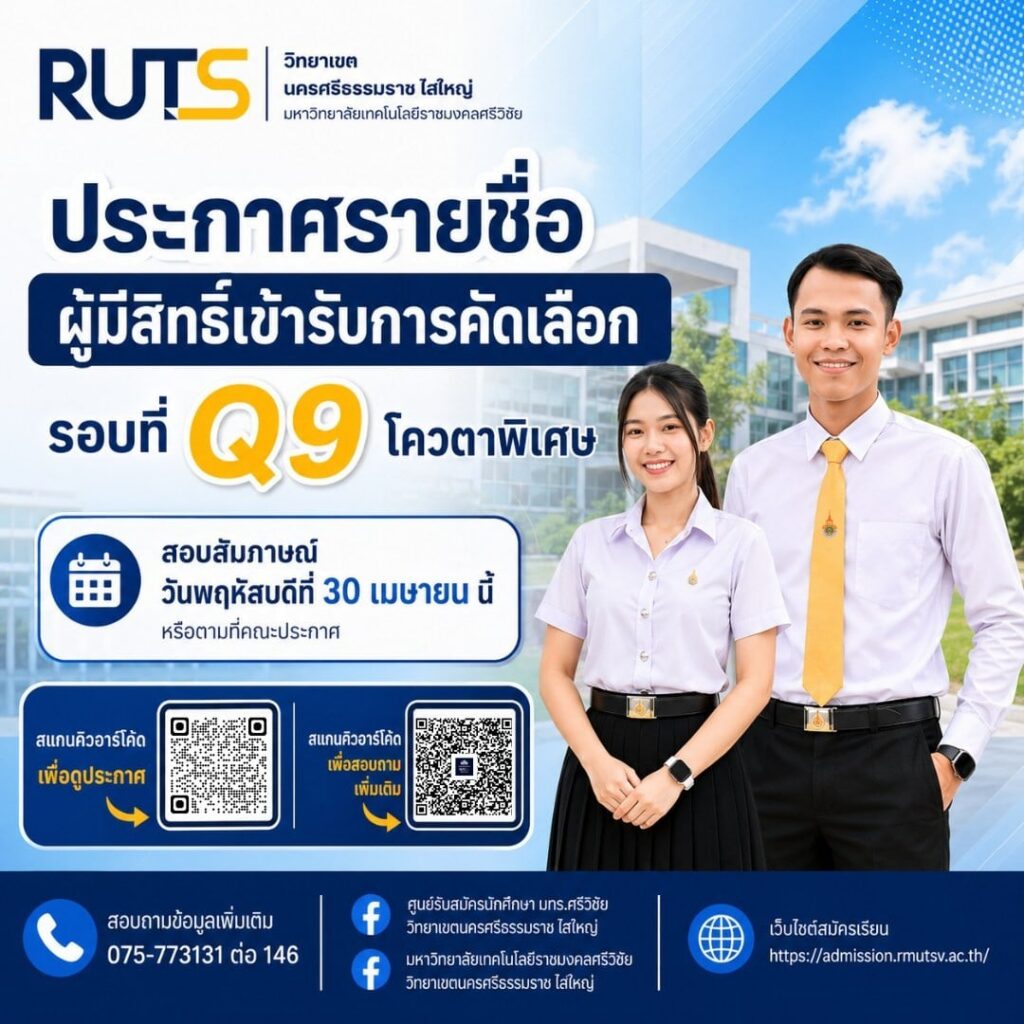 ประกาศรายชื่อ ผู้มีสิทธิ์เข้ารับการคัดเลือก ปีการศึกษา 2569 รอบที่ Q9 โควตาพิเศษ วิทยาเขตนครศรีธรรมราช พื้นที่ไสใหญ่ เข้าสู่กระบวนการคัดเลือก โดยวิธีการสอบสัมภาษณ์แบบออนไลน์ ในวันที่ 30 เมษายน 2569 หรือ ให้นักศึกษาดูประกาศของคณะที่สมัคร ที่เอกสารแนบด้านล่าง อย่างละเอียด!