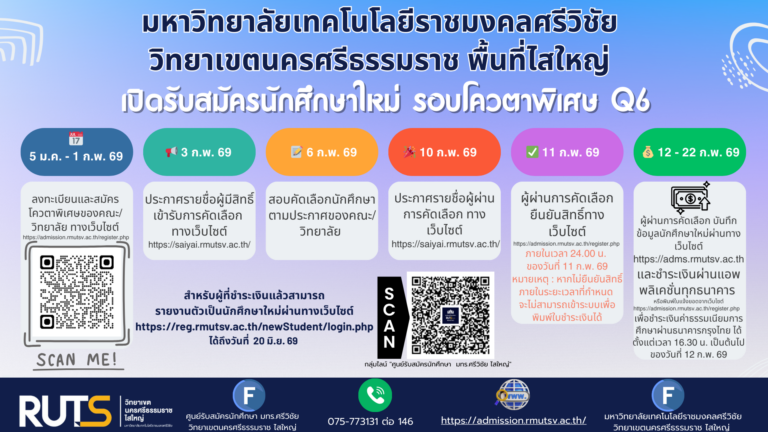 ผู้สนใจศึกษาต่อ มหาวิทยาลัยเทคโนโลยีราชมงคลศรีวิชัย วิทยาเขตนครศรีธรรมราช พื้นที่ไสใหญ่ เปิดรับสมัครนักศึกษา ปีการศึกษา 2569 รอบที่ Q6 โควตาพิเศษ ฟรีค่าสมัคร5 มกราคม 20265 มกราคม 2026