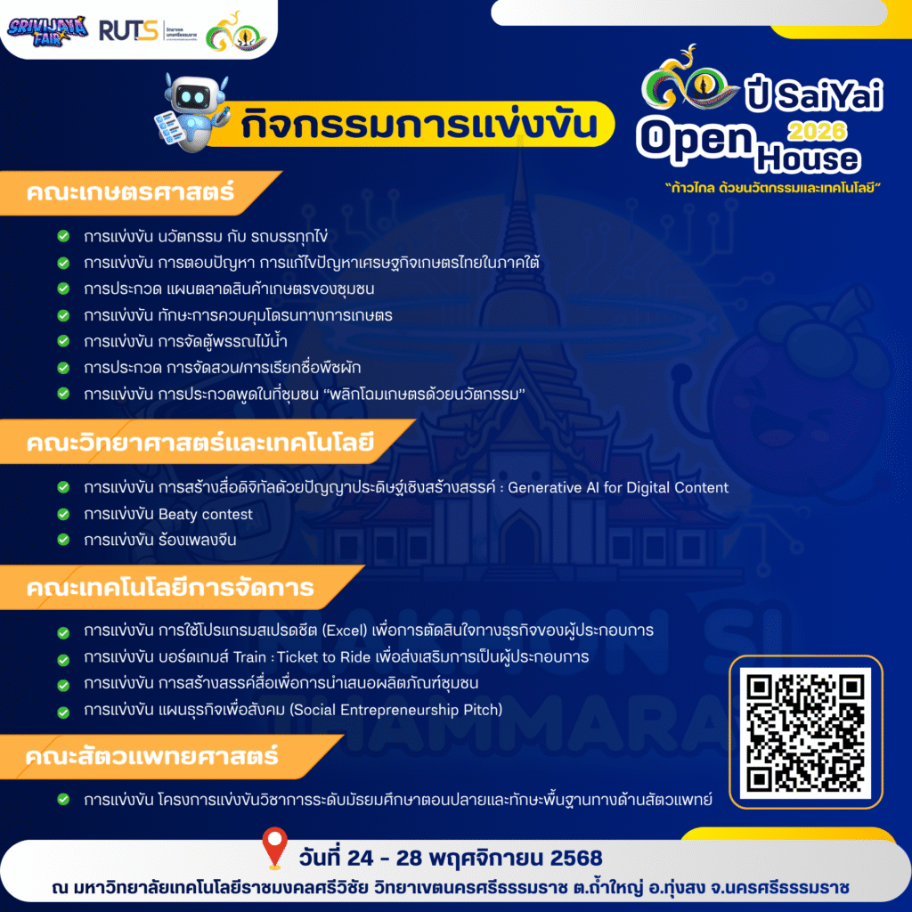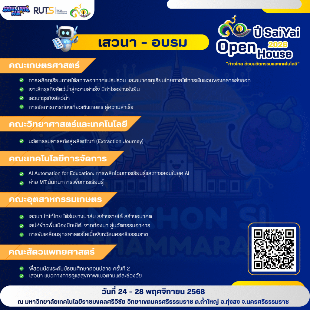 ©2025 มหาวิทยาลัยเทคโนโลยีราชมงคลศรีวิชัย วิทยาเขตนครศรีธรรมราช พื้นที่ไสใหญ่ All rights reserved.